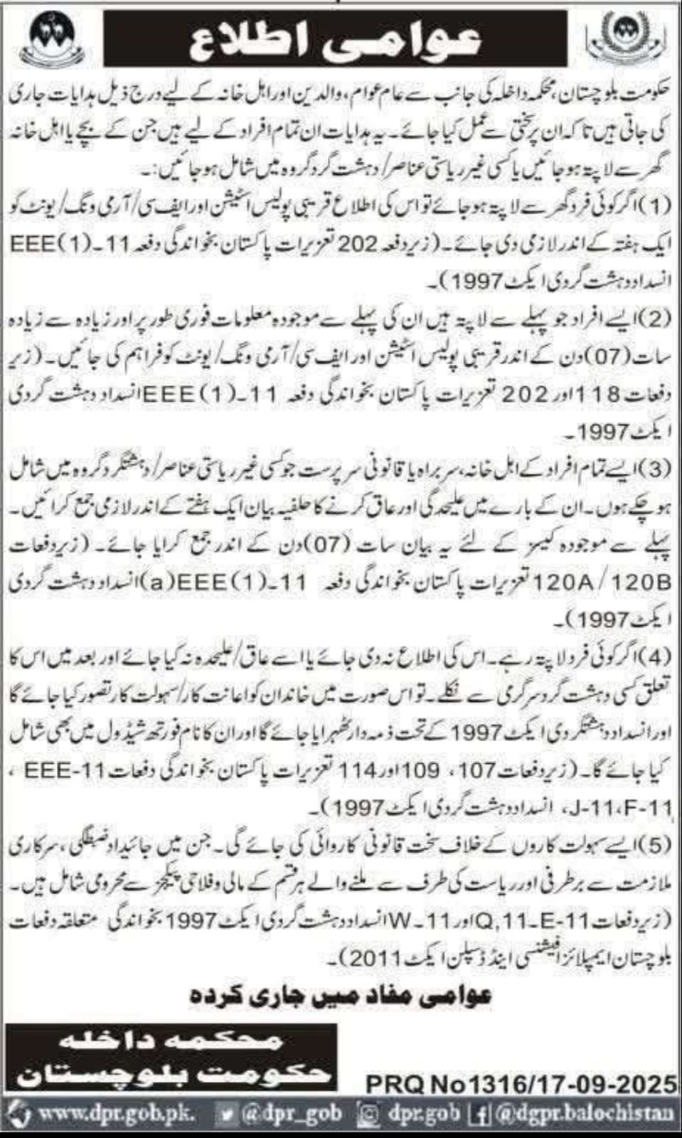 BALOCHISTAN: The Government of Balochistan has reiterated that families of individuals who join terrorist organisations such as the Balochistan Liberation Army (BLA), Baloch Liberation Front (BLF), and their factions, and fail to report or formally dissociate themselves from such elements, will face strict legal and administrative restrictions.