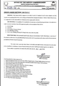 NORTH WAZIRISTAN: In order to ensure law and order in the district during Eid-ul-Fitr, Deputy Commissioner Mohammad Yusuf Karim has issued a directive for the implementation of Section 144 in the entire district of North Waziristan.