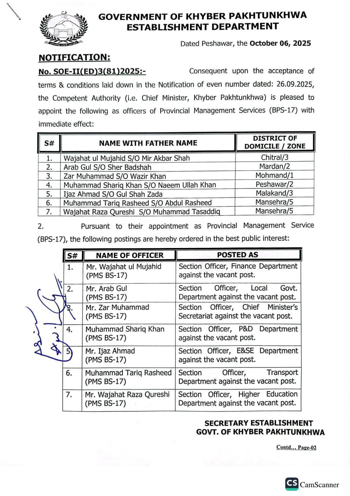 According to the notification, the appointment of these officers has been made with the approval of the Chief Minister of Khyber Pakhtunkhwa. The appointed officers include Wajahat Al-Mujahid, Arab Gul, Zar Muhammad, Muhammad Shariq Khan, Ijaz Ahmed, Muhammad Tariq Rashid and Wajahat Raza Qureshi.