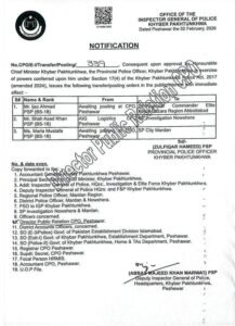 The notification states that public interest requires the transfers which will be implemented according to Section 17(4) of the Khyber Pakhtunkhwa Police Act 2017 and will start working immediately.