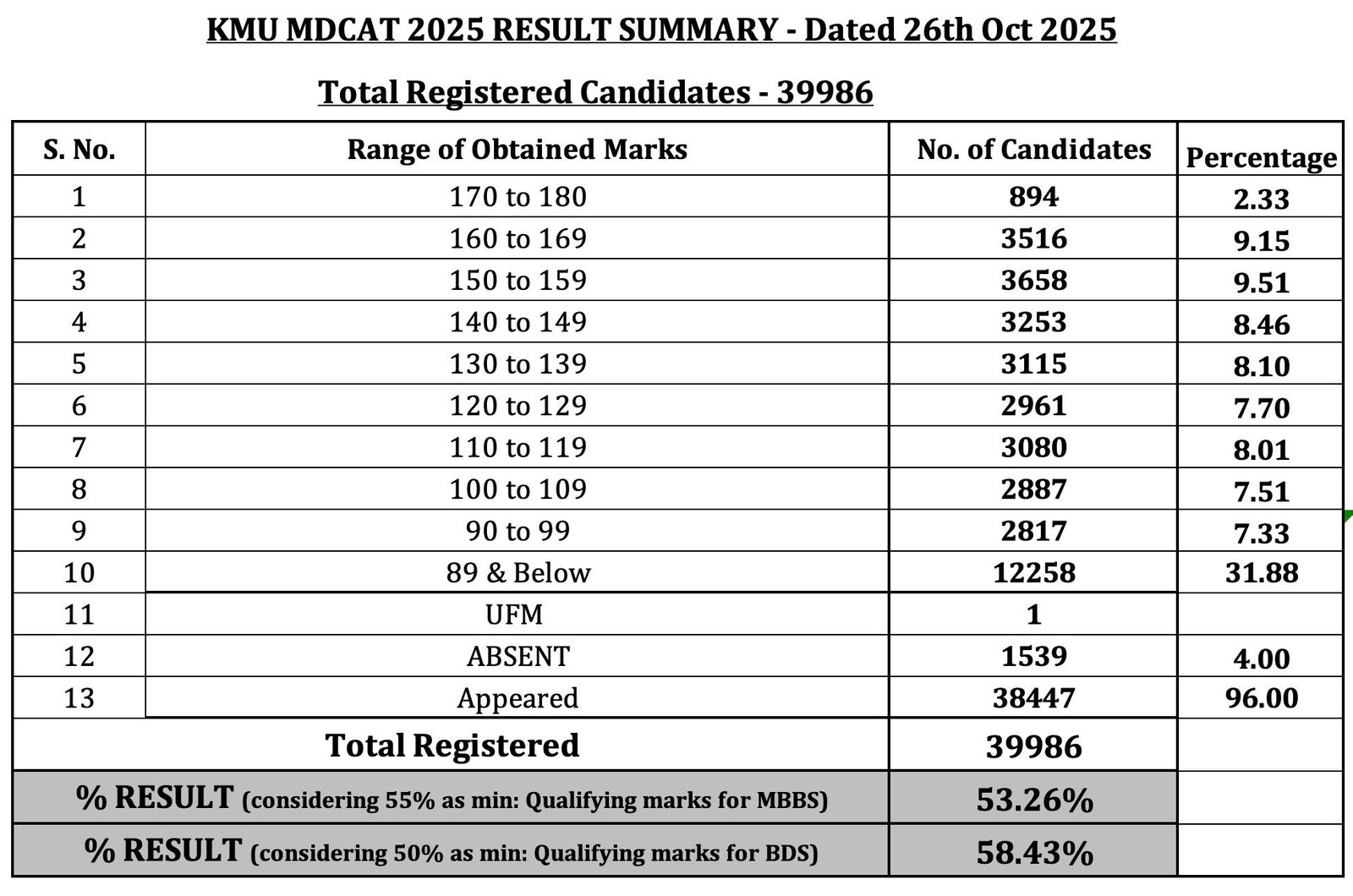 KMU reported that 1539 candidates did not appear for the exam. However, 39,986 candidates from across Khyber Pakhtunkhwa had registered for MD CAT 2025.