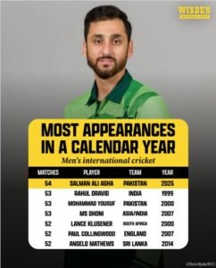 In the year 2025, Pakistan’s cricket team has so far played 54 international matches and Salman Ali Agha has been a part of all of them. This awesome work has made him the player with the highest number of international matches in a single year of the calendar.